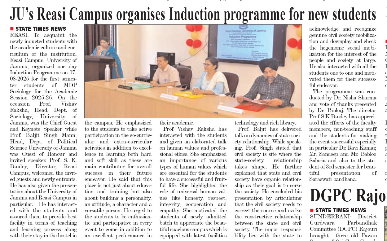 Reasi Campus is going to organize one day Induction Programme on 07-08-2025 for the students of the Academic Session 2025-26.